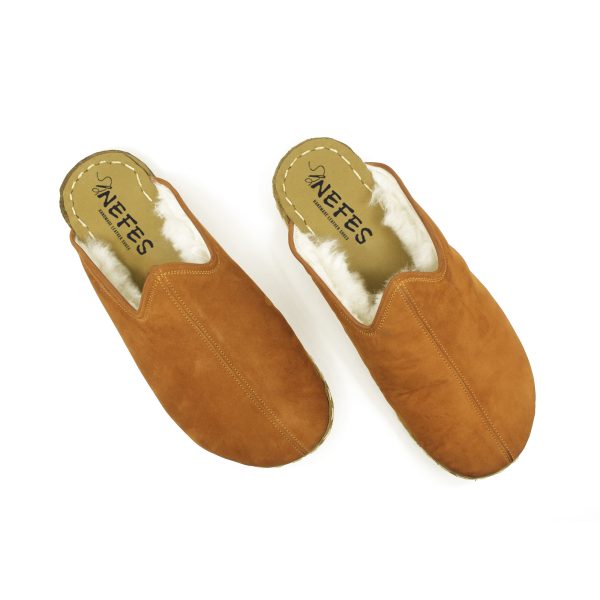 El Yapımı Barefoot Yalınayak Erkek Deri Parçalı İçi Kürklü Terlik, Hardal Nubuk