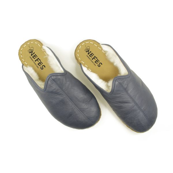 El Yapımı Barefoot Yalınayak Erkek Deri Parçalı İçi Kürklü Terlik, Lacivert
