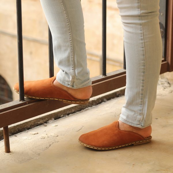 El Yapımı Barefoot Yalınayak Erkek Deri Parçalı Terlik, Hardal Nubuk