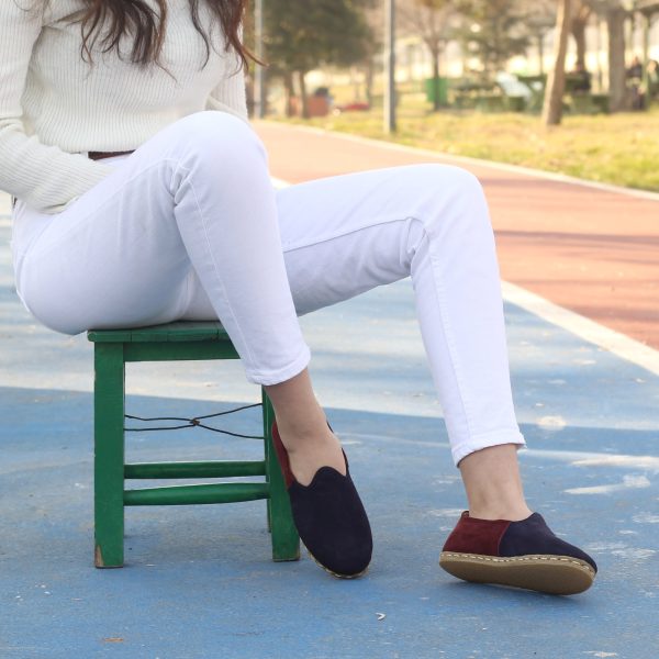 Bordo Lacivert Düz Dana Derisi Nubuk Kadın Yemeni Çarık
